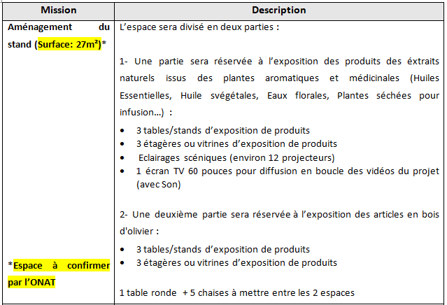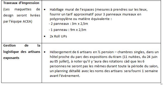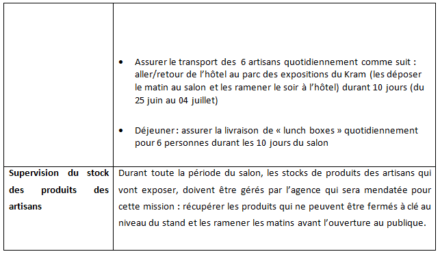 La mission de l’agence sera de prendre en charge l’organisation de l’epace d’exposition (son aménagement, la gestion du stock des produits, les impressions, ect.) ainsi que l’organisation du séjour des artisans.