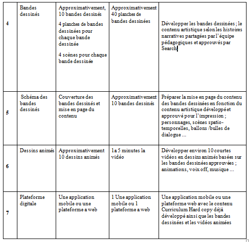 Une partie des responsabilités clés est de développer un contenu éducatif et de transformer les données fournies par le comité technique et la recherche en contenu artistique sous trois formes différentes, des livres, des vidéos et une plate-forme numérique (une application mobile ou un site Web). Le contenu artistique doit être adapté au public cible qui sont les élèves et les enseignants, qui font partie de l’Initiative Nationale sur le Programme D’éducation à la Paix en Tunisie. Le but du soutien artistique est d’augmenter la résilience des élèves et d’accroître les valeurs normatives positives chez les enfants et des jeunes Tunisiens dans leur environnement local, national et mondial. Le cadre des travaux du soumissionnaire comprendra les livrables suivants :