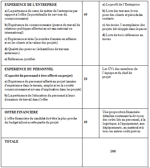 Cette évaluation sera basée sur les réponses fournies dans les documents de soumission des candidats, en utilisant les exigences fonctionnelles de la section TERMES DE REFERENCE. Les valeurs du seuils fixées pour la qualification d’une offre sont de 80/100 et tous toutes candidatures qui obtiennent une note inférieure à ce score seront éliminés.