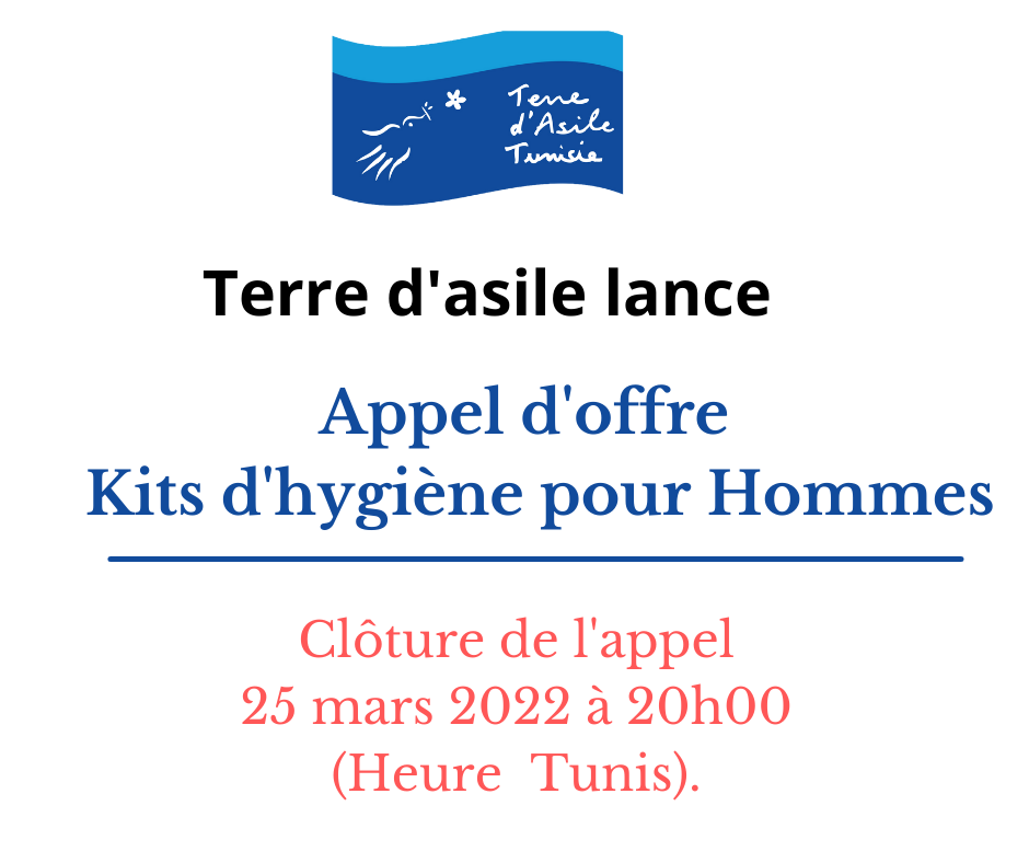 Dans le cadre des aides d’urgence, Terre d’Asile Tunisie lance un appel d’offre pour l’achat de composantes des kits d’hygiène au profit de ses bénéficiaires.
