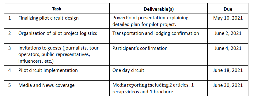 This will include reviewing the circuits prepared internally, gathering additional data from the field and providing recommendations for the proposed circuits. The contractor will organize the transportation and eventually lodging for the participants of at least one pilot tour. Participants will be mainly composed of journalists, tour operators, travel agencies, public authorities’ representatives while ensuring the highest safety measures. The Contractor will be responsible for coordinating activities of the ACEA team including: planning, organizing and implementing pilot circuits, preparing and implementing a communication campaign.