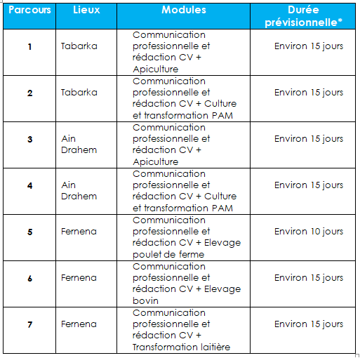 Formations des jeunes et femmes pour la participation aux sessions de formation professionnelle à Tabarka, Ain Drahem, et Fernena.