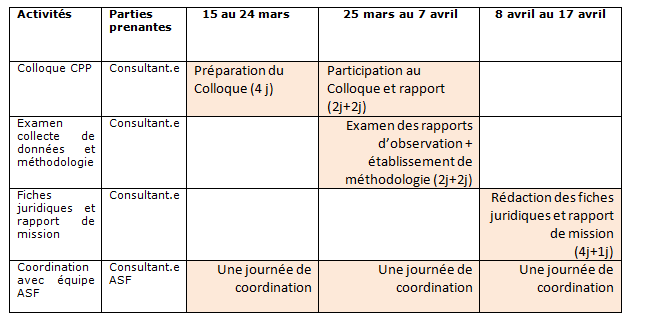 La/le consultant appuiera l’équipe d’ASF dans l’organisation d’un Colloque sur la réforme du Code de procédure pénale. Elle/il examinera les axes de travail, les rapports et les données collectées dans le cadre du projet RSJ afin de proposer des démarches avenirs qui permettront d’atteindre les objectifs du projet. Ce travail s’effectuera en étroite collaboration avec le coordinateur du projet RSJ et le conseiller technique d’ASF.