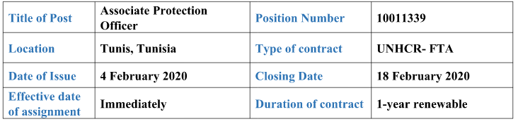 The Associate Protection Officer in Tunis reports to the Senior Protection Officer., the incumbent may have supervisory responsibility for protection staff as required. He/she provides functional protection guidance and supervises protection standards, operational procedures and practices in protection delivery in line with international standards.