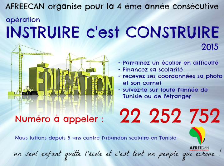 Le projet Instruire c’est Construire est un projet que mène à terme l’association AFREECAN chaque année et depuis 5 ans, dont le but est de combattre l’ignorance et l’abandon scolaire dans les régions défavorisées en prenant en charge la scolarité à long terme d’écoliers démunis et en réalisant des actions de terrain et des travaux dans leurs écoles délabrées leur offrant ainsi les conditions minimales d’éducation et de santé. Défi 2013-2014 : école d’Awled Merai Teboursok Béjà (120 km de Tunis) Défi 2014-2015 : école de Machrawa (village frontalier avec l’Algérie coupé du reste du pays, 200 km de Tunis)