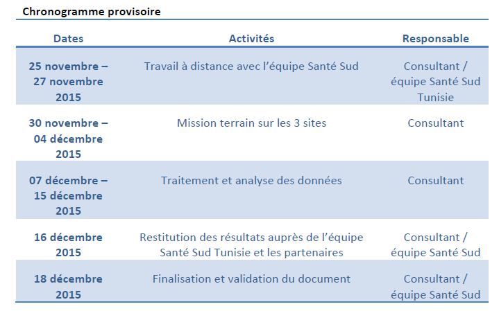 D’une manière plus précise, l’évaluation vise à dresser et analyser un pattern de résultats. Le consultant va se rendre sur les trois sites partenaires du projet pour mener des entretiens avec les bénéficiaires du projet et sur Tunis pour conduire des entretiens avec l’équipe du projet à Santé Sud. Il fournira une analyse critique et constructive sur les stratégies développées, les outils de suivi-évaluation mis en oeuvre et la gestion des informations.