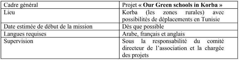 Le coordinateur du projet sera basé au siège de l’association tunisienne de la protection de la nature et de l’environnement de Korba situé à rue Taher Ben Achour, Korba avec de multiples sortis sur terrain dans les écoles primaires et tout autre lieu en Tunisie.