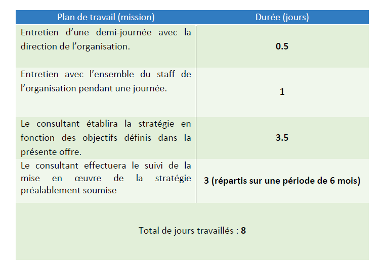Le ou la consultant(e) devra élaborer, en collaboration avec l’équipe d’Aswat Nissa, une stratégie de recrutement de bénévoles et consolider sa mise en oeuvre. Le ou la consultante devra participer une demi-journée de discussion avec la direction et une journée de brainstorming avec l’équipe afin de s’imprégner des valeurs et des objectifs de l’organisation qui lui serviront à la production de la stratégie. Il/elle devra consacrer 3 jours de suivi dans les 6 mois suivant la production de la stratégie. Il/elle devra produire un document stratégique destiné à Aswat Nissa comprenant la stratégie globale de recrutement des bénévoles mais également les éléments suivants :