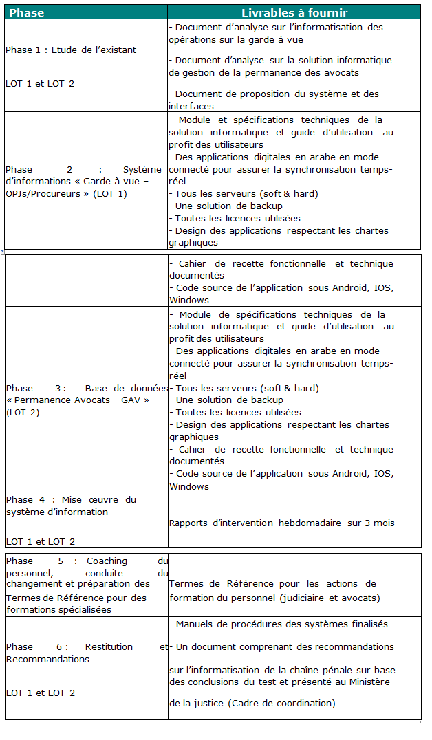 La liste des livrables à fournir lors de l’implémentation du projet est présentée dans le tableau ci-dessus. Cette liste est donnée à titre non limitatif, le consultant aura toute la latitude de la complémenter éventuellement et ce, conformément à la méthodologie de travail proposée.