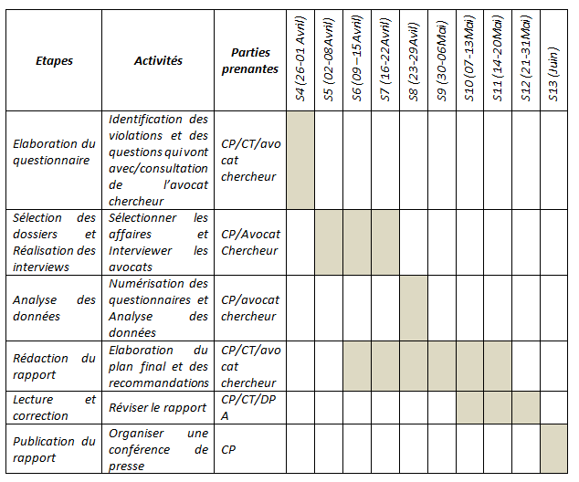 Pour accomplir tout ce travail, ASF compte recruter un consultant qui jouera un rôle substantiel tout au long de l’élaboration de ce rapport. En effet, ce consultant qui aura la qualité d’un avocat-chercheur aidera ASF à mettre en œuvre cette méthodologie tout au long des différentes étapes de travail. Ce dernier suivra et interviendra dans l’accomplissement du rapport par:
