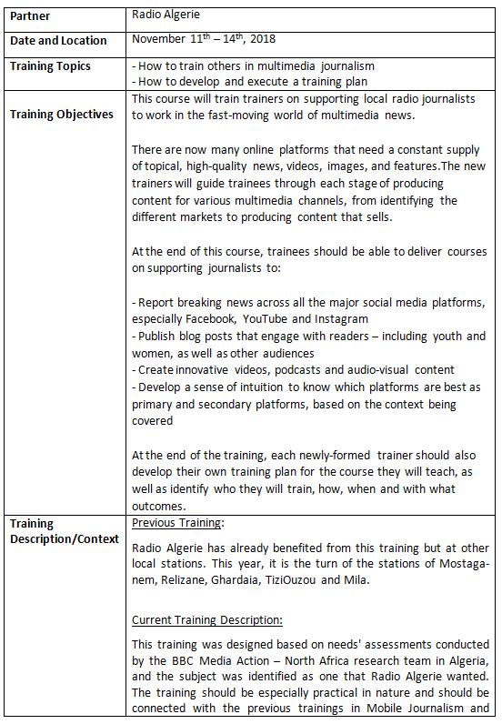 Training Title: Training of Trainers (ToT) on Multimedia Journalism for Radio Algerie