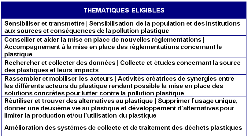• La réalisation d’initiatives de terrain afin de changer les comportements sociétaux vis-à-vis de l’utilisation non raisonnée des plastiques,
