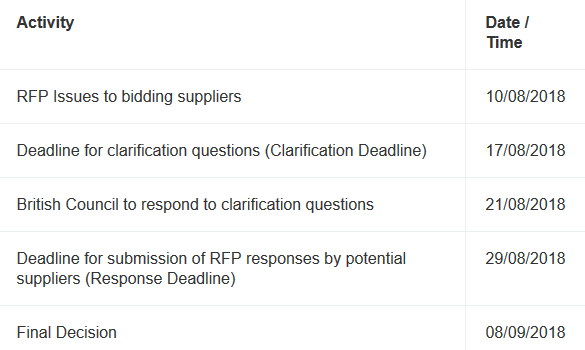 Subject to any changes notified to potential suppliers by the British Council in accordance with the Tender Conditions, the following timescales shall apply to this Procurement Process: