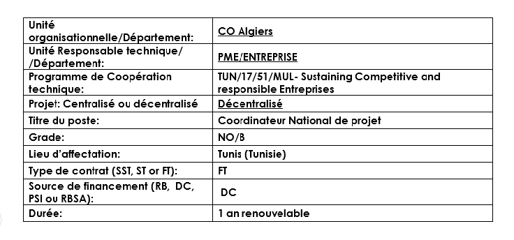 Sous la supervision générale du Directeur du Bureau de l’OIT pour les pays du Maghreb à Alger et la supervision technique du Conseiller Technique Principal du projet SCORE au siège (département Entreprise), le Coordinateur National de Projet est responsable de la mise en œuvre du cadre logique du projet SCORE et de la stratégie nationale approuvée par les donateurs et le Comité consultatif national tripartite.
