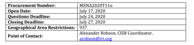 Submission Instructions Bids must be submitted via email to Alexander Robson, at [email protected] with the subject line “MENA2020T11o” by the deadline listed above.