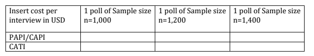 It is IRI’s preference that data collection for this survey is conducted through face-to-face interviews (PAPI/CAPI). Should this be impossible or inadvisable, IRI will accept proposals for phone interviews (CATI.)