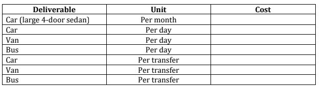 • Pricing for one car per month, inclusive of taxes. Offeror should also submit pricing for one van, one additional car, and one bus per day and per airport transfer or other transfer (if available)