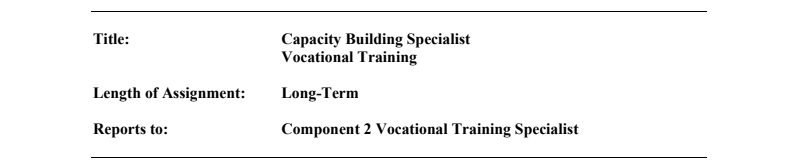 The Capacity Building Specialist for Vocational Training reports to the Vocational Training Specialist.