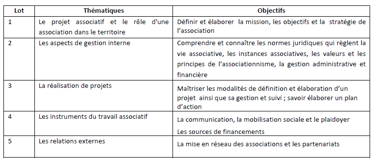 Dans le cadre du projet « Renforcement des Autorités Locales et des OSC pour l’implémentation de politiques publiques municipales » un plan de renforcement des capacités (PRC) visant les OSC de trois zones d’intervention a été élaboré suite à la réalisation d’un diagnostic du tissu associatif local. Le PRC sera mis en place à travers des sessions de formations qui portent sur les thématiques suivantes :