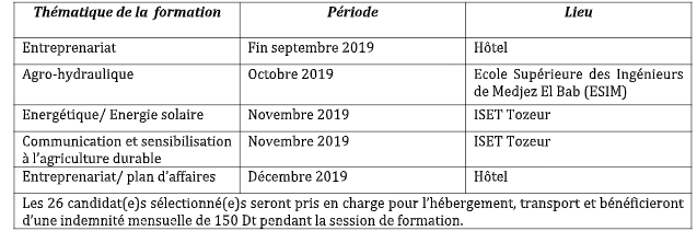 le Centre Méditerranéen des Energies Renouvelables-MEDREC, désigné en tant qu’agent d’exécution du projet « Energies Renouvelables pour le Développement Agricole et Rural en Tunisie » – (REFAT) dans le cadre d’un programme de coopération technique bilatérale entre le Ministère de l’Environnement Italien (IMELS) et le Ministère de l’Agriculture Tunisien (MARHP), lance un appel à candidature pour sélectionner vingt-six (26) jeunes diplômé(e)s pour la participation à une session de formation sur les applications des énergies renouvelables et les pratiques agricoles éco-durables, ainsi qu’ à un programme d’accompagnement et de support à la création d’entreprises.