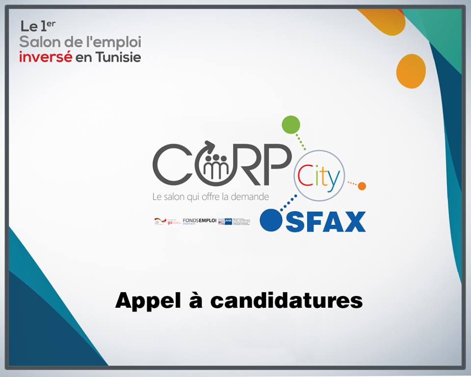 Cet appel à participants s’inscrit dans le cadre de la deuxième édition dusalon CORP CITY: premier Salon de l’Emploi INVERSE en Tunisie, organisé par le Centre d’Orientation et de Reconversion Professionnelle, le CORP, projet de la Chambre Tuniso-Allemande de l’Industrie et du Commerce en collaboration avec le Fonds Emploi GIZ (Coopération Internationale Allemande) mandatée par le Ministère fédéral de la Coopération économique et du Développement (BMZ).