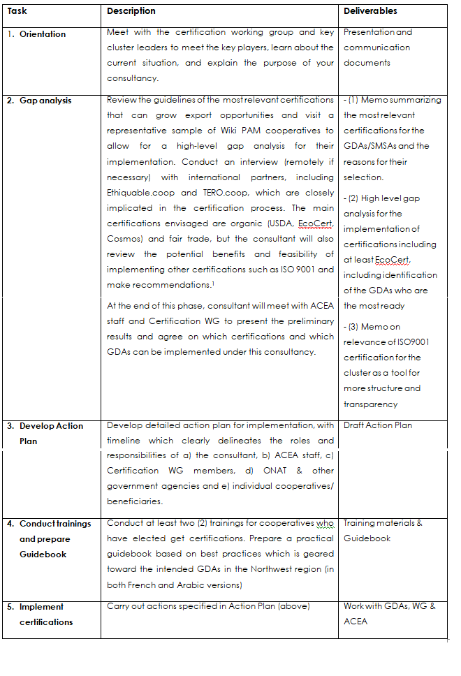 Within the framework of initiating and assisting the development of the “WIKI PAM” Cluster of natural extracts in northwest Tunisia, the Certification Specialist will be overseeing and supporting the cluster’s efforts to achieve the necessary certifications for export. Most of this work would require close collaboration with the cluster’s Certification Working Group, one of six Working Groups which are the action arms of the Cluster. The Certification WG focuses on quality diagnosis and identifying the certification requirements for GDAs. The Certification Specialist will be responsible of the overall assistance and guidance of the group to achieve its goals and implement established action plans, including the training of all the staff concerned. Additionally, the certification specialist will be asked to make recommendations regarding the relevance and feasibility of implementing other certifications, such as a quality management system of ISO 9001, for Wiki PAM producers.