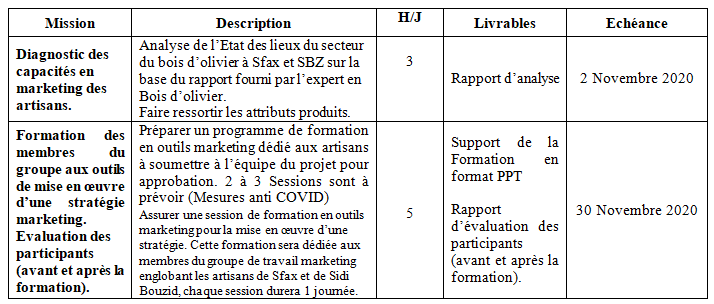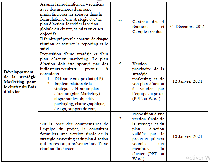 Développement de la stratégie : Identification et affinement des axes de la stratégie Marketing du cluster en interaction avec les autres groupes, le suivi de la mise en œuvre de son plan d’action, proposition d’ajustements ou de modifications s’il y a lieu, diffusion auprès des membres du cluster et reporting. Pour définir la stratégie marketing, le consultant devra s’appuyer sur le rapport de diagnostic du secteur, soumis par l’expert national en bois d’olivier ainsi que le rapport de segmentation stratégique élaboré par le cabinet international mandaté par le projet ACEA. L’un des principaux livrables sera de définir des pistes d’amélioration pour les produits du secteur, afin de les rendre compétitifs sur les marchés internationaux.