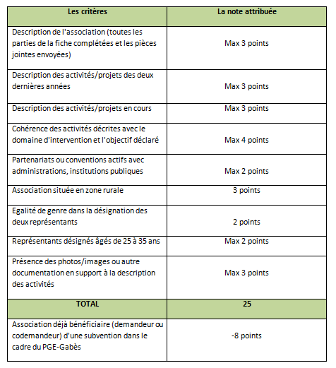 Les OSC qui ne bénéficient pas d’une subvention élargie dans le cadre du programme PGE-Gabès (Projet d’appui à la gouvernance environnementale locale de l’activité industrielle à Gabès) seront considérées prioritaires.