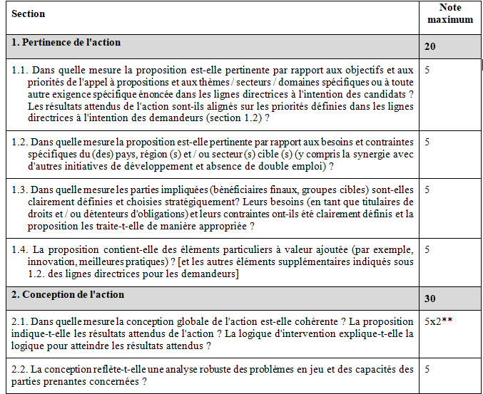 Les demandes complètes qui passent ce contrôle avec succès sont ensuite évaluées au regard de leur qualité, y compris en ce qui concerne le budget proposé et la capacité des demandeurs et de l’entité ou des entités affiliées, sur la base des critères d’évaluation de la grille d’évaluation reproduite ci-après. Il existe deux types de critères d’évaluation: les critères de sélection et les critères d’attribution.