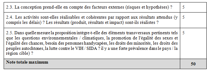 Les notes succinctes de présentation se verront attribuer une note globale sur 50, ventilée suivant la grille d’évaluation ci-après. L’évaluation permettra aussi de vérifier la conformité avec les instructions relatives à la manière de remplir la note succincte de présentation, qui figurent dans la partie A du formulaire de demande de subvention.