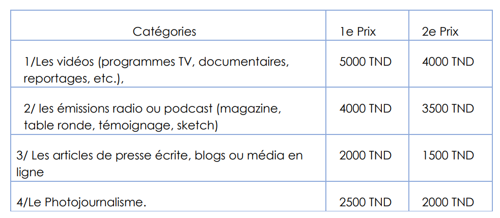 On aura deux gagnants dans chaque catégorie. Les prix seront en nature, des matériels selon le choix des gagnants pour leurs encourager à continuer leurs passions pour la production de contenus, (Caméra ou Laptop, etc.), et de valeur comme indiquée dans le tableau suivant :