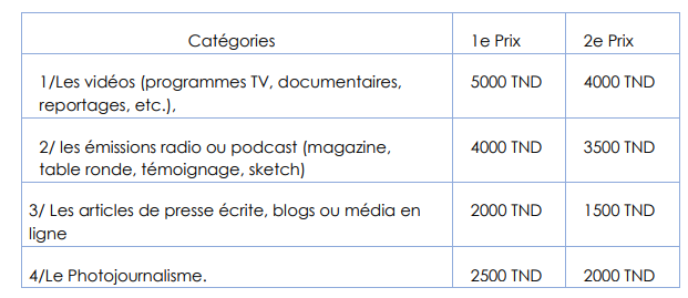 On aura deux gagnants dans chaque catégorie. Les prix seront en nature, des matériels selon le choix des gagnants pour leurs encourager à continuer leurs passions pour la production de contenus, (Caméra ou Laptop, etc.), et de valeur comme indiquée dans le tableau suivant :