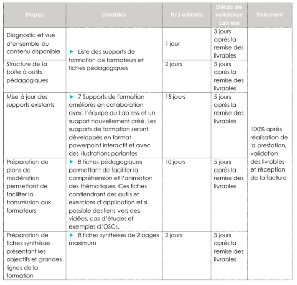 L’objectif de cette mission est le développement d’une boîte à outils pédagogiques à destination d’organisations qui accompagnent et forment des organisations de la société civile. Le consultant partira d’un contenu existant et développé par le Lab’ess afin de le structurer, de l’organiser de façon plus didactique et de le compléter par des plans de modération adaptés aux thématiques de formation.