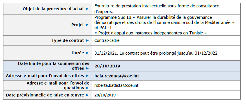 Les informations générales et les coordonnées de contact pour cette procédure figurent sur la présente page. En cas de question, nous vous invitons à utiliser les coordonnées du Conseil de l’Europe indiquées ci-dessous. Toute question doit être adressée au moins 5 (cinq) jours ouvrables avant la date limite de soumission des offres et exclusivement à l’adresse électronique ci-dessous, en indiquant la référence suivante en objet : Questions – Consultation en matière de liberté d’expression et pluralisme des médias Tunisie et dans la région MENA 2019-2021.