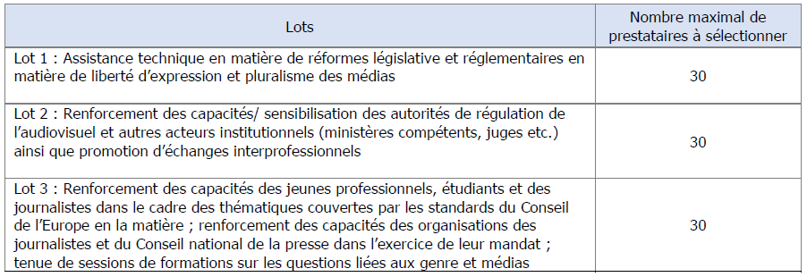 Les soumissionaires peuvent soumettre des offres pour un ou plusieurs des lots. Le Conseil de l’Europe peut sélectionner un prestataire pour un ou plusieurs lots pour lesquels il a postulé. Dans le cas où le prestataire est choisi pour multiples lots, il sera pris en compte dans le calcul du nombre maximum de consultants pour chacun des lots concernés.