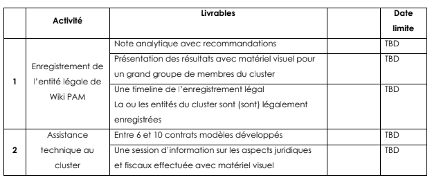 Assister le cluster Wiki PAM dans sa structuration : sur la base de la timeline proposée, le contractant assistera le cluster dans les démarches administratives en soumettant un dossier complet aux autorités concernées et facilitera la représentation formelle du cluster en coordination avec l’Animateur du cluster2