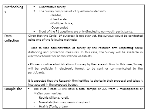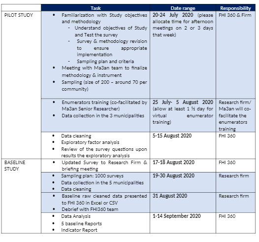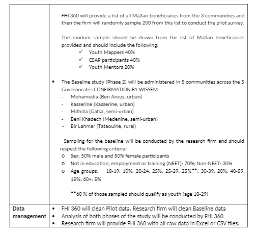 FHI360 has designed the methodology and quantitative survey instrument and will be responsible for translating the survey into Arabic and conducting the analysis. Survey instrument is available on request at [email protected].