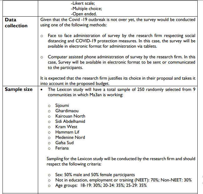 sample of 250 youth between the age of 18 and 29 years selected randomly from the 10 targetcommunities above. The survey sample will include 70% of respondents that are not in education, employment or training (NEET) and 30% non-NEET. Ma3an will hire a specialized research company to accomplish data collection for the survey. The Ma3an research team will receive the raw data set from the hired company and will be responsible for producing analysis and conclusions from the survey data.