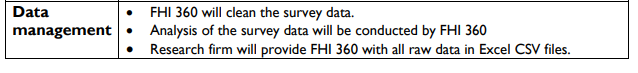 FHI360 has designed the methodology and quantitative survey instrument (draft in annex) and will be responsible for translating the survey into Arabic and conducting the analysis.
