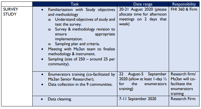 Ma3an is looking to hire an experienced research firm to conduct survey data collection for the first part of the study. This will include, sampling, survey administration and data cleaning. The firm is NOT responsible for analyzing data and producing the study report. These will be undertaken by Ma3an.