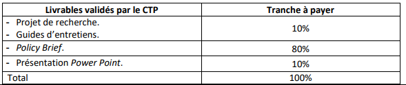 Le paiement se fera sur trois tranches, suite à la validation des livrables par le CTP du projet Tarabot (PNUD) :