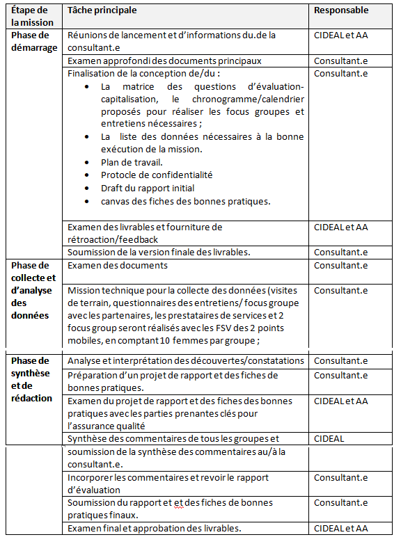 • Une description du processus de l’évaluation et de la capitalisation (le plan de mise en place de la mission, La matrice des questions d’évaluation-capitalisation, le chronogramme/calendrier proposés pour réaliser les focus groupes et entretiens nécessaires ;