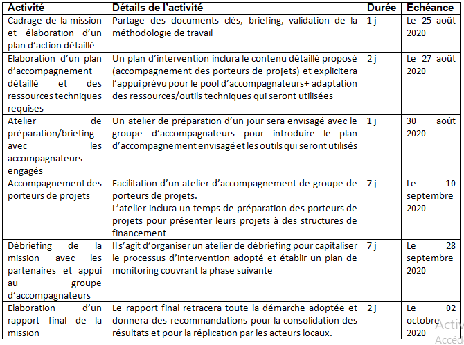 La durée totale de la mission est estimée à 20 jours de consultance qui seront répartis selon le calendrier suivant :