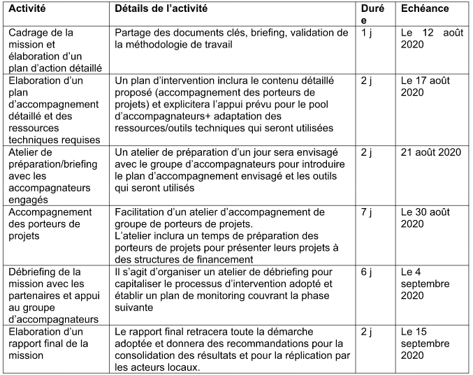 La durée totale de la mission est estimée à 20 jours de consultance qui seront répartis selon le calendrier suivant :