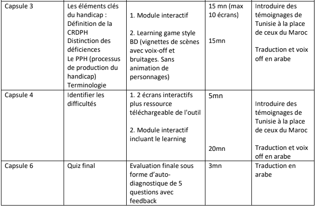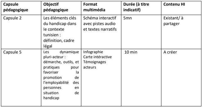Toutefois, les actions de formation en présentiel réaliser dans le cadre du projet, ne permet pas de toucher un grand nombre des professionnels des structures d’accompagnement et / ou des cadres des entreprises privées. Pour toucher une cible plus large des entreprises et des professionnels de l’accompagnement et de l’insertion socio-économique, nous envisageons de compléter notre offre de formation par un module e-learning. Ce module e-learning pourra être intégré à la demande sur les plateformes des partenaires sociaux des entreprises en Tunisie UTICA / CONECT ou des structures partenaires, ainsi que de prévoir une version sur clé USB pour élargir les champs de diffusion de ce module.
