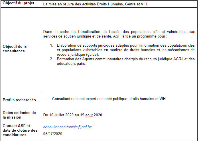 Dans le cadre de la mise en œuvre de la subvention VIH Sida du programme de partenariat avec le Fonds Mondial de lutte contre le Sida, la tuberculose et le paludisme, Avocats sans frontières recrute un(e) consultant(e)-formateur(trice) national(e) expert(e) en santé publique, droits humains et VIH pour l’élaboration de supports juridiques adaptés au profit des populations clés et populations vulnérables en matière de droits humains et mécanismes de recours juridique (guide) et pour la formation des Agents communautaires chargés du recours juridique ACRJ et les éducateurs pairs jeunes.