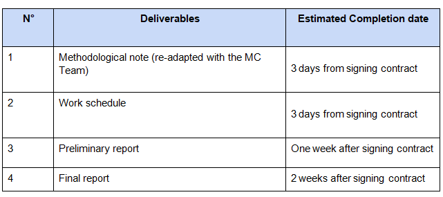 The identified consultant must send a methodological note which indicates how to collect quantitative data as well as qualitative one, and make sure to respond on all key indicators.