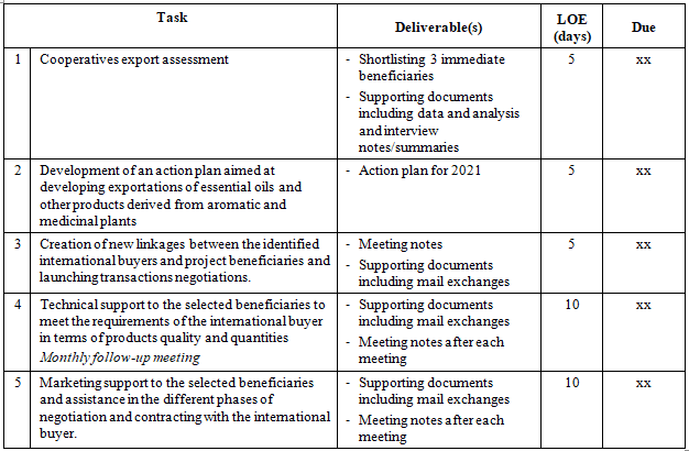 Considering the imperative to prepare the direct beneficiaries of the project to the contact with an international identified client specialized in fair trade, concerned about the level of quality and the capacities of routing of the products towards the export, the expert is in charge of supporting the beneficiaries cooperatives in North West Tunisia in terms of improving the techniques of production of essential oils and methods of transporting these products to the international market. He will accompany the beneficiaries of the project until the realization of export operation.