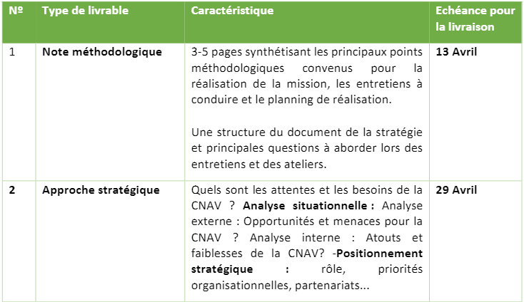 •Note méthodologique pour la conduite de la mission: à la suite d’une réunion avec le COPIL, une note méthodologique sera élaborée et validée. Cette note confirmera le chronogramme de la mission, ainsi que la liste des entretiens à réaliser.