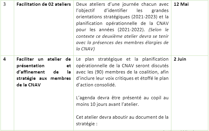 •Facilitation de deux ateliers réunissant les membres du COPIL: ces ateliers viseront à identifier, en premier lieu, les grandes orientations stratégiques de la CNAV pour trois ans2021-2023.Il s’agira précisément de co-identifier et de définir d’une manière participative la vision, la mission, les valeurs et les objectifs de la CNAV à moyen terme. L’objectif étant d’unifier les intérêts des partenaires de la CNAV pour une vision partagée et commune.